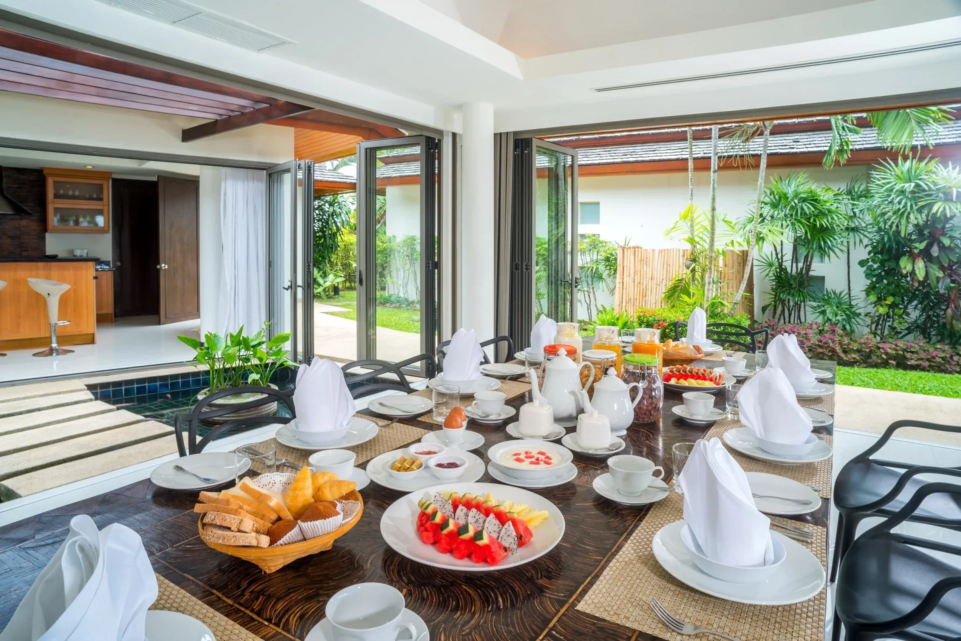 Un chef privado está disponible para preparar comidas en la villa bajo solicitud y coste adicional, encargándose desde la planificación del menú hasta la compra de ingredientes y el servicio de cocina tailandesa, asiática u occidental.