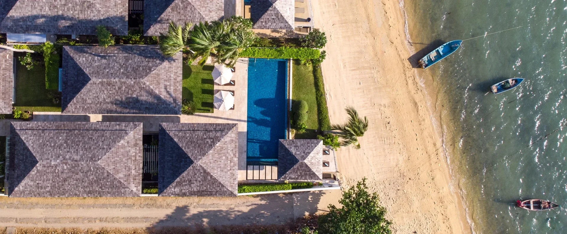 Líneas contemporáneas, elementos tradicionales tailandeses y un entorno de jardines tropicales con vistas abiertas a Bophut Beach. Su arquitectura se articula en pabellones de planta abierta, con detalles en madera y grandes puertas acristaladas que favorecen la entrada de luz natural.